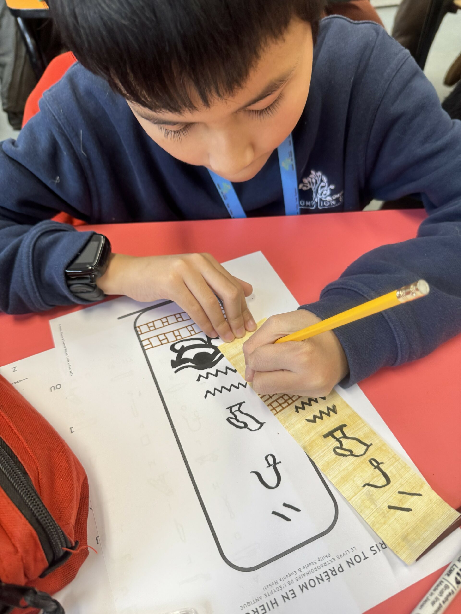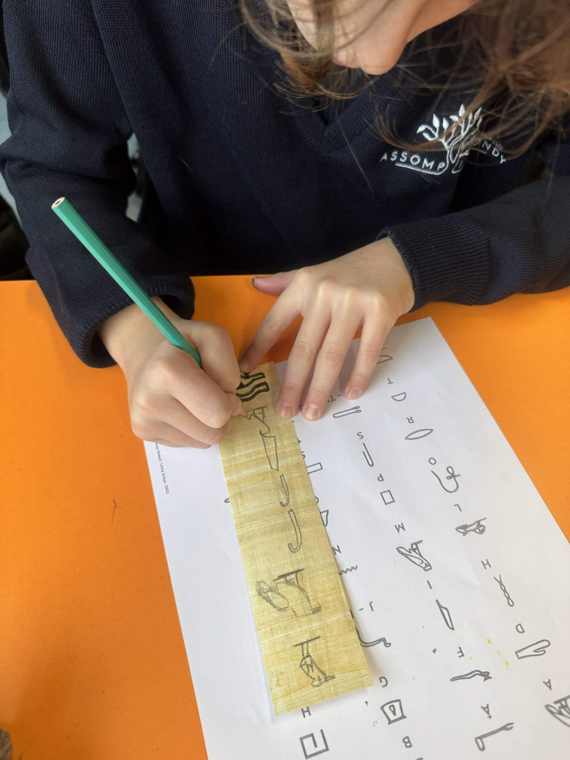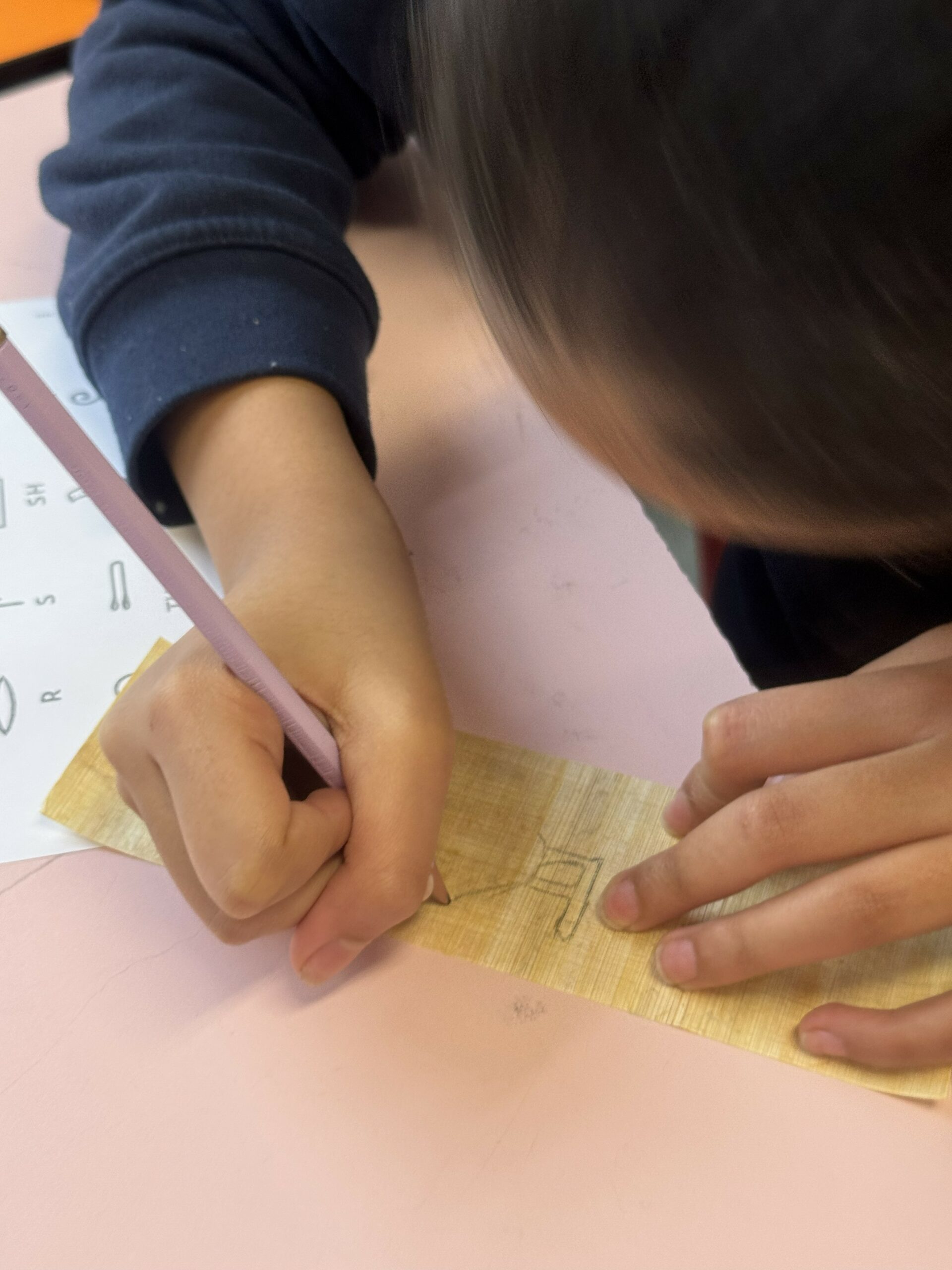 En parallèle, la classe a expérimenté l’écriture égyptienne en traçant des hiéroglyphes sur de véritables feuilles de papyrus.