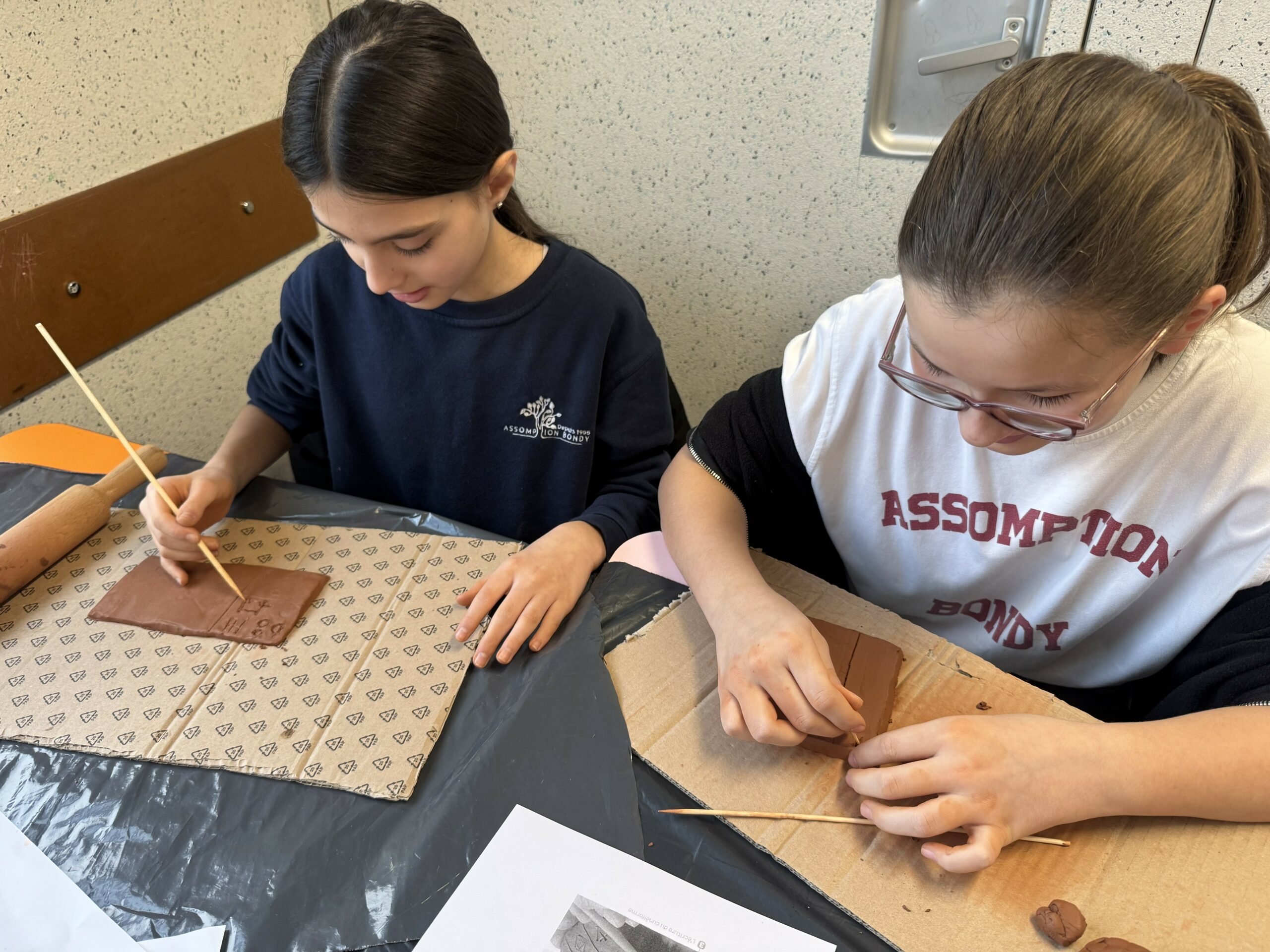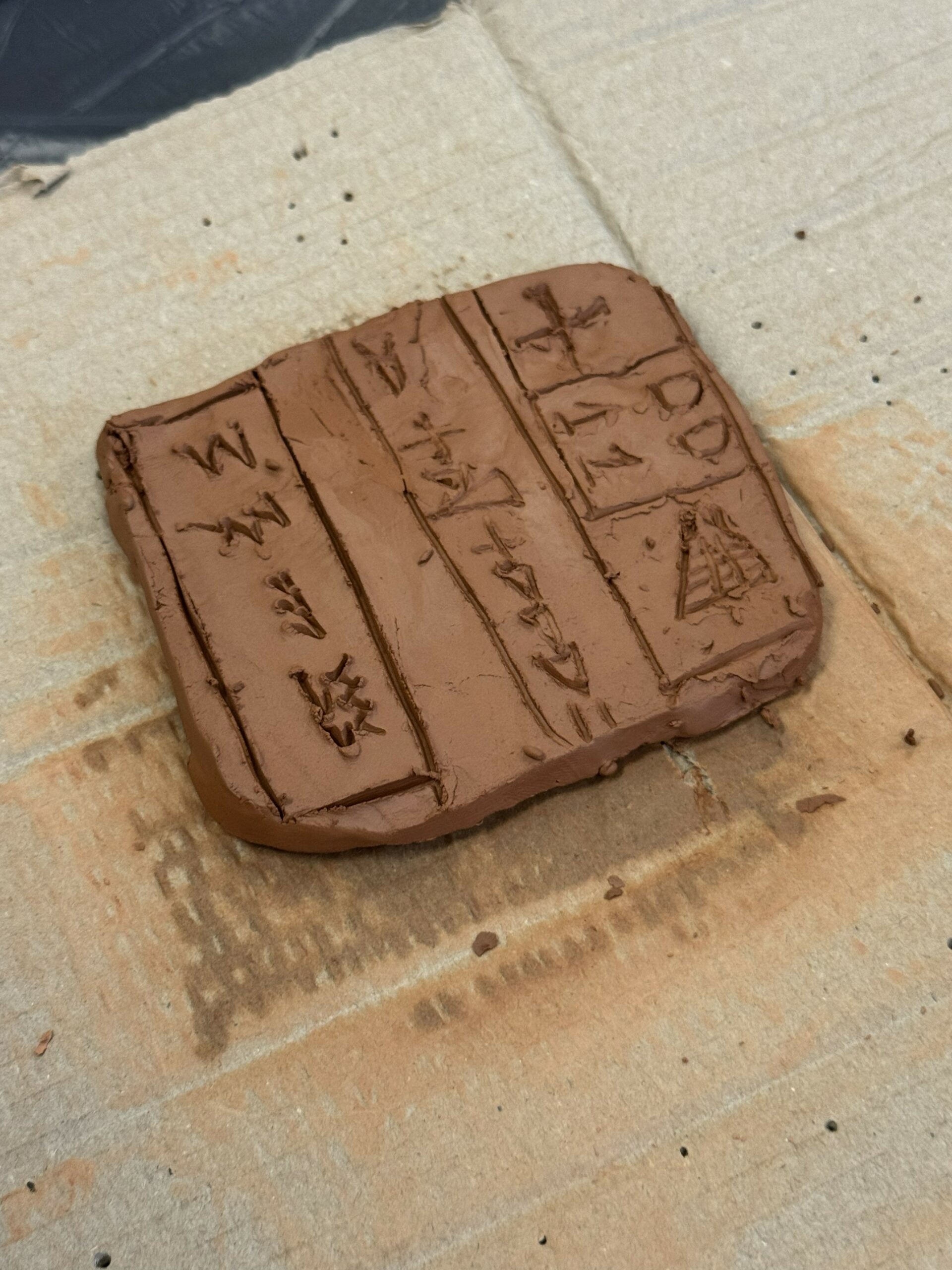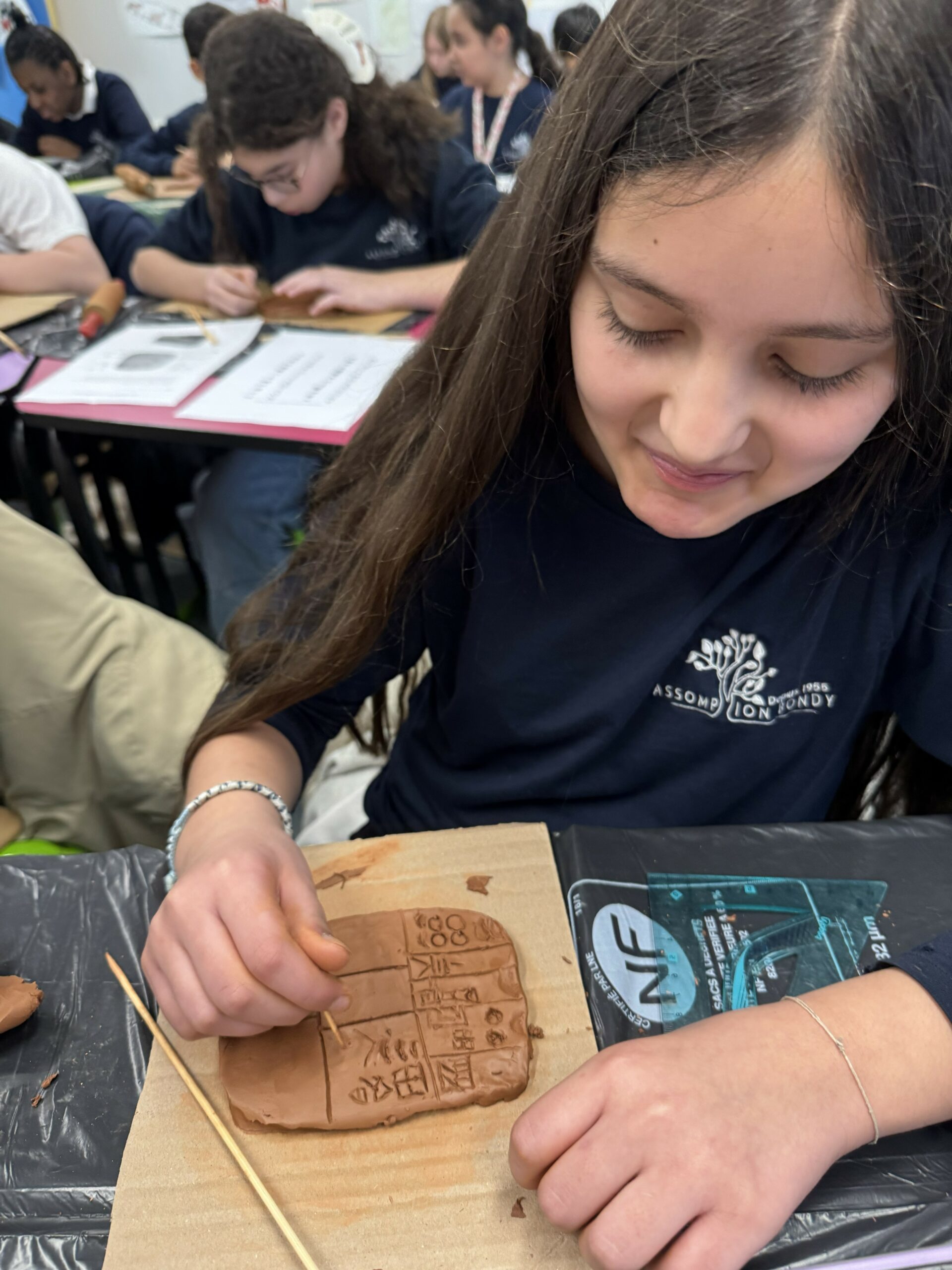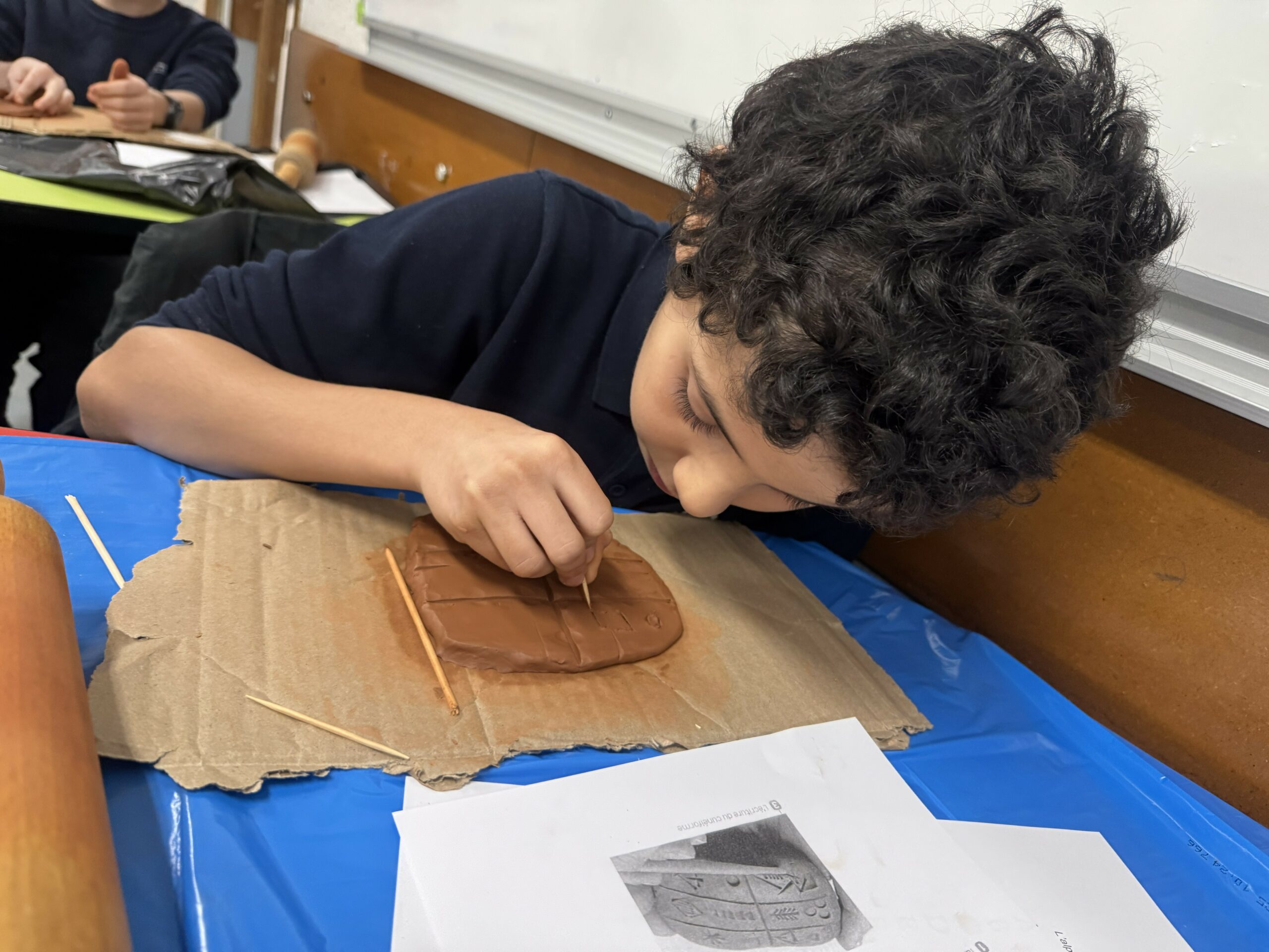 Les élèves se sont initiés à l’écriture cunéiforme en réalisant leurs propres tablettes d’argile. À l’aide d’un pic à brochette, utilisé en remplacement du calame, ils ont gravé des signes caractéristiques en forme de coins.