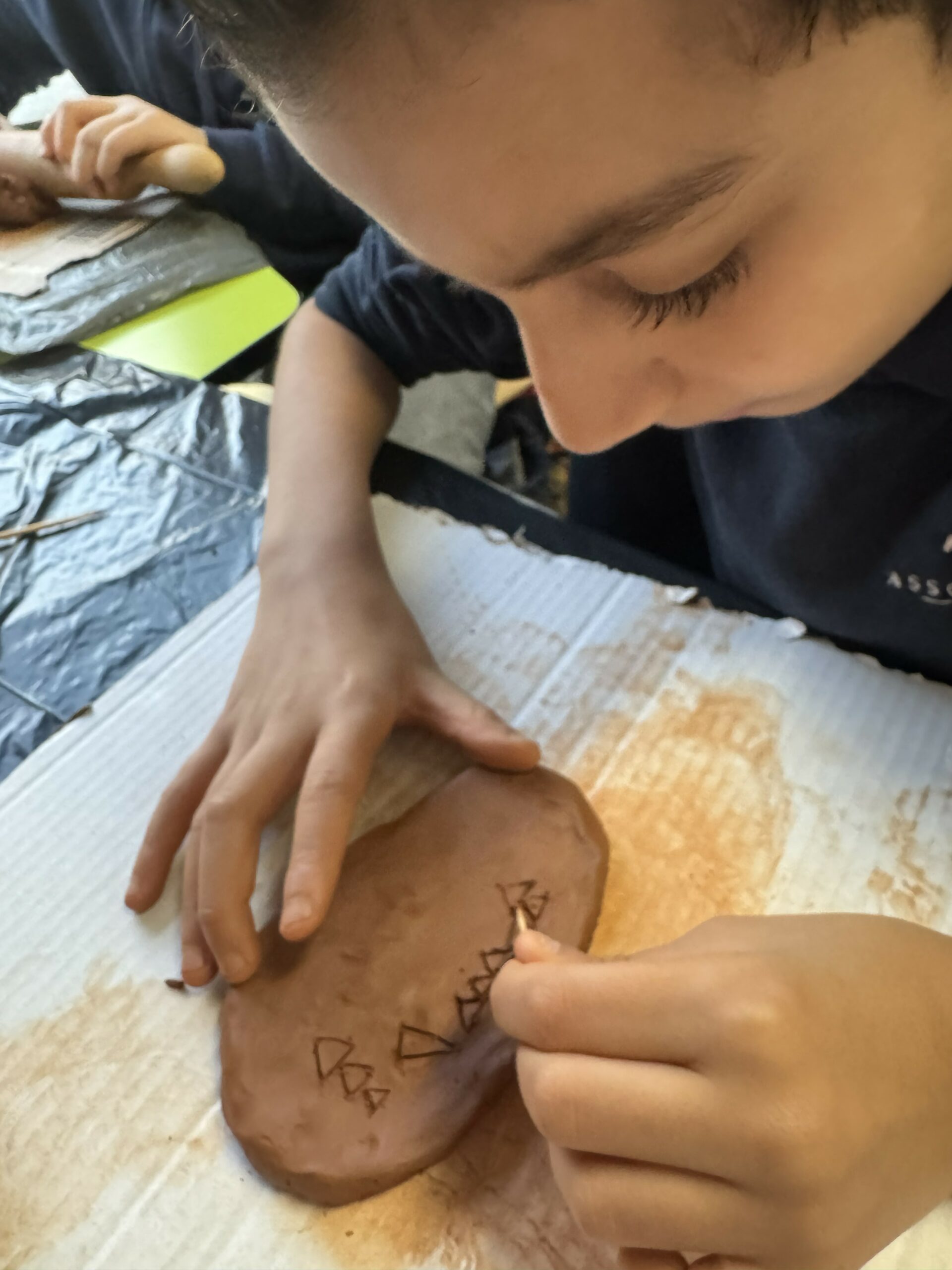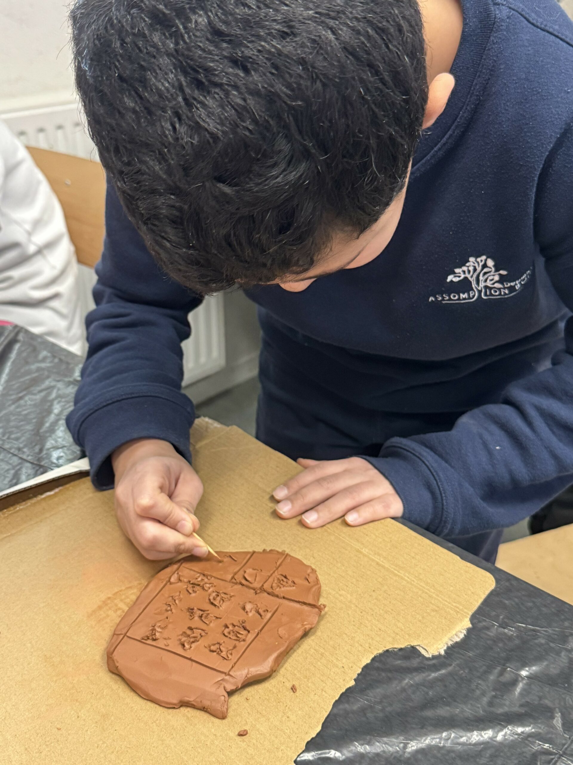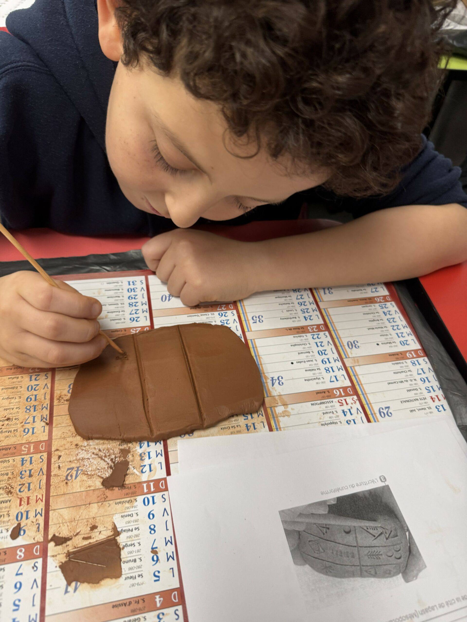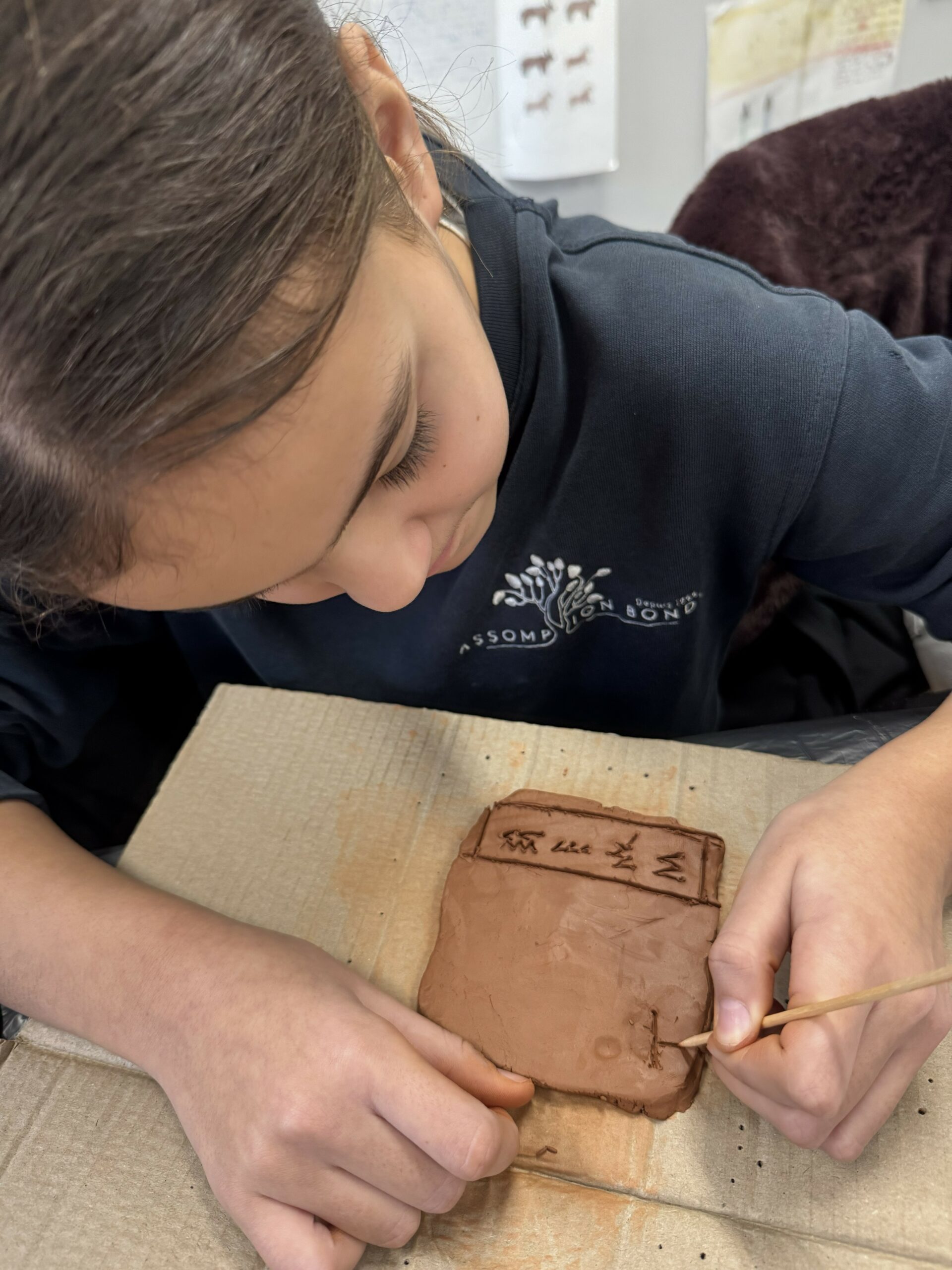 Les élèves se sont initiés à l’écriture cunéiforme en réalisant leurs propres tablettes d’argile. À l’aide d’un pic à brochette, utilisé en remplacement du calame, ils ont gravé des signes caractéristiques en forme de coins.