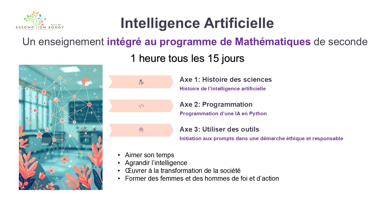 Notre établissement a choisi d’intégrer l’intelligence artificielle (IA) au sein du programme de mathématiques de seconde, afin de permettre à chaque élève de découvrir les enjeux, les principes et les usages de cette technologie qui transforme notre société.